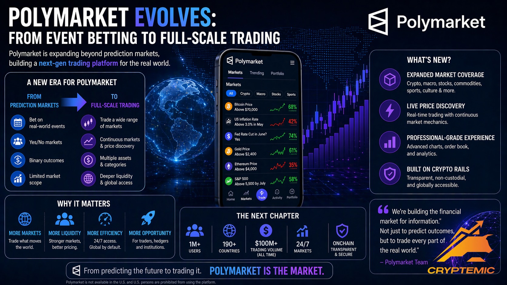 Платформа предсказаний Polymarket объявила о расширении в сторону деривативов и планирует запустить бессрочные фьючерсы (perpetual futures) в США. Это означает переход от контрактов на исход событий к классическому трейдингу с плечом на активы вроде Bitcoin, акций и сырья.