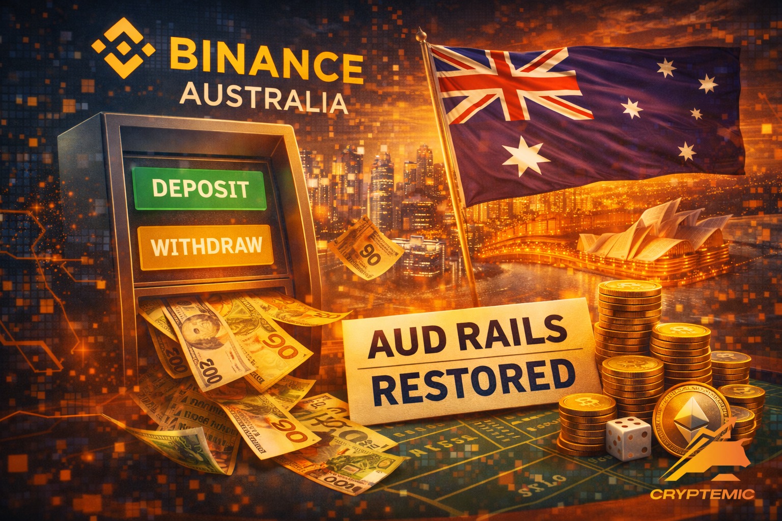 Binance Australia восстановила депозиты и вывод средств в австралийских долларах, завершив почти двухлетний период ограничений, начавшийся в середине 2023 года. С января 2026 года все верифицированные пользователи снова могут напрямую переводить средства между своими банковскими счетами и биржей.
