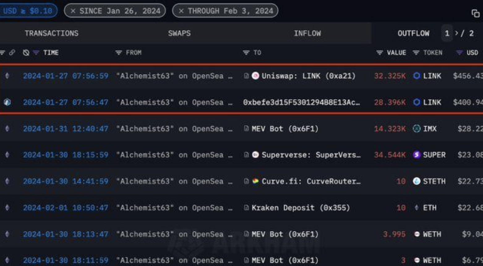 Используя скомпрометированную учетную запись «Alchemist63», хакеры быстро выполнили две транзакции по опустошению кошелька после получения необходимых разрешений на подпись. Первая транзакция унесла 400 940 долларов, за ней последовала вторая, 12 секунд спустя, убрав еще 456 400 долларов. Это произошло из-за того, что жертва случайно дала зеленый свет обеим мошенническим транзакциям, нацеленным на токены LINK.