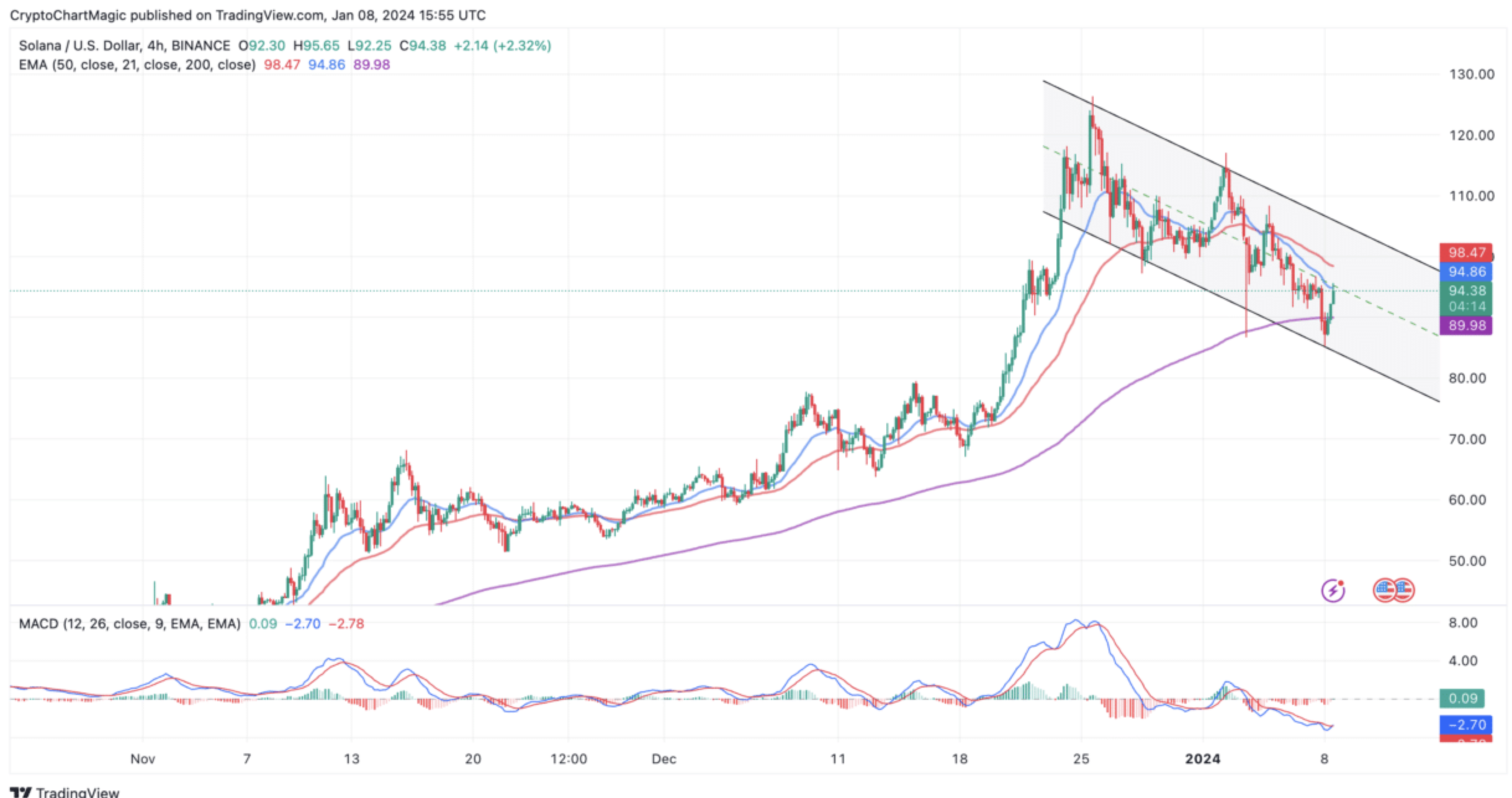 Текущая траектория Соланы выглядит бычьей, о чем свидетельствует недавний сигнал на покупку индикатора конвергенции скользящей средней (MACD). Криптовалюта торгуется выше 200-дневной экспоненциальной скользящей средней (ЕМА) и приближается к решающему сопротивлению на уровне 95 долларов, отмеченному 20-ЕМА и средней границей нисходящего канала. Успешный прорыв этого сопротивления может привести к тому, что Солана значительно преодолеет порог в 100 долларов, особенно если произойдет FOMO инвесторов, как это произошло в четвертом квартале 2023 года.