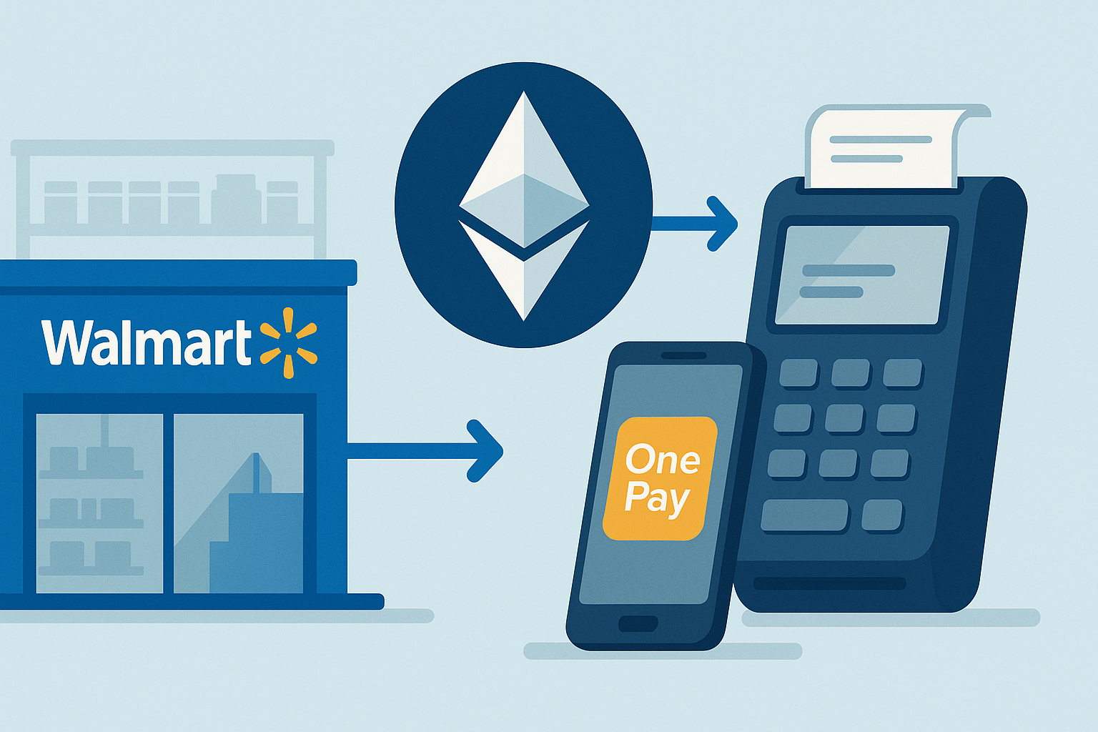 Крупнейший ритейлер США, Walmart, начал пилот по приёму платежей в эфире (ETH) через мобильное приложение OnePay. В тестовом режиме покупатели смогут оплачивать покупки токенами ETH напрямую из встроенного кошелька, а система мгновенно конвертирует криптовалюту в доллары — так Walmart получает оплату в фиатe в реальном времени и не хранит ETH на балансе. По задумке, клиент не ощущает волатильности криптовалюты, поскольку обмен происходит моментально и происходит по курсу, который виден в момент оплаты. Тест проводят совместно с локальными финтех-партнёрами, которые обеспечивают инфраструктуру и обмен.